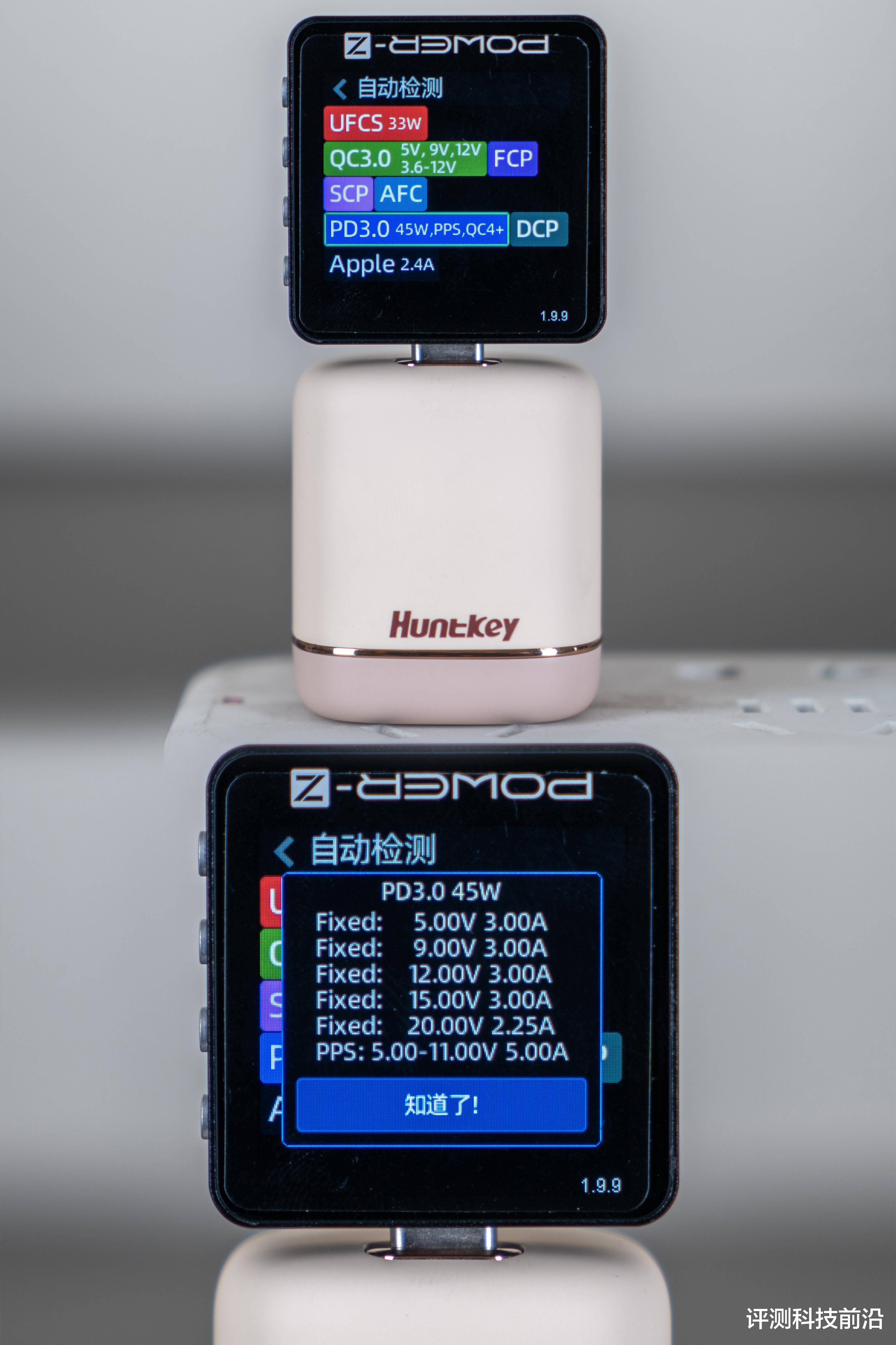 ▼首先用POWER-Z KM003C测试一下快充协议,通过KM003C测试结果可以看到它支持QC3.0/4+、UFCS、FCP、SCP、AFC、PD、PPS、DCP、Apple 2.4A等,基本涵盖了市面上大部分手机的充电协议,从PDO报文可以看到还具备5V3A、9V3A、12V3A、15V3A、20V2.25A五档固定电压,除此之外还有一档5-11V5A的PPS电压挡位,最高输出功率为45W