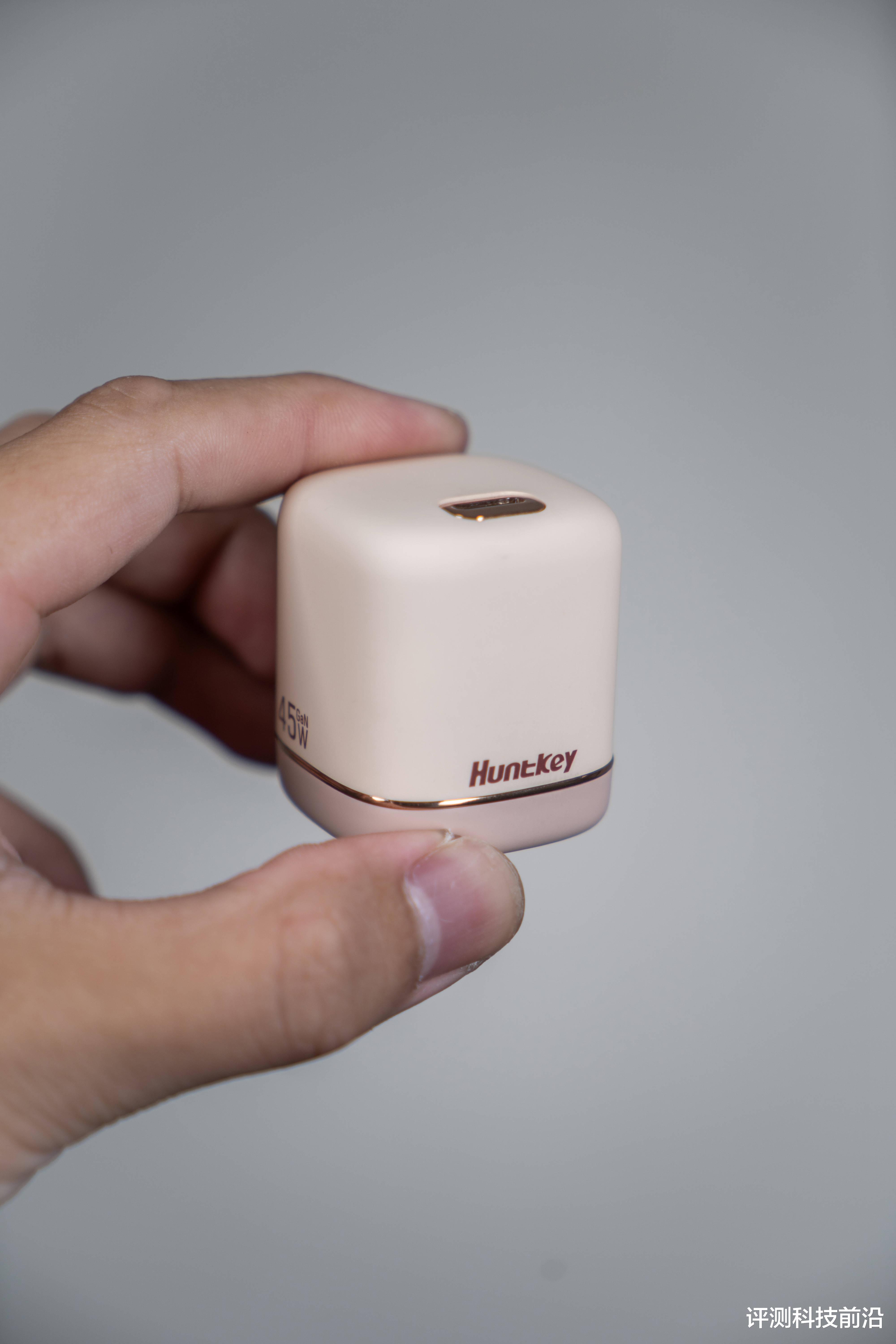 ▼主体为两段式设计,连接处用金属质感的电镀条做装饰,整体是一个奶茶粉的配色,看起来很清新很好看,表面采用了准分子肤感漆面,超细腻的手感和观感,看不到一丝颗粒感,如果是常规的那种磨砂塑料表面,哪怕用好的磨砂处理工艺,也完全达不到这款航嘉奶茶充电器这样的质感,表面也不容易留下指纹印;这款充电器为单口设计,C口周围也有一圈电镀做点缀,插脚是可折叠的,做工这么好的充电头我有点舍不得带出去用