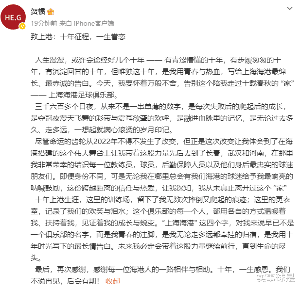 贺惯在文中说,我要怀着万般不舍,告别这个陪我走过十载春秋的 “家”——上海海港足球俱乐部。过去的三千六百多个日夜,从来不是一串单薄的数字,是每次失败后的爬起后的成长,是夺冠夜漫天飞舞的彩带与震耳欲聋的欢呼,是融进血脉里的记忆,是无论过去多久、走多远,一想起就满心滚烫的岁月印记。