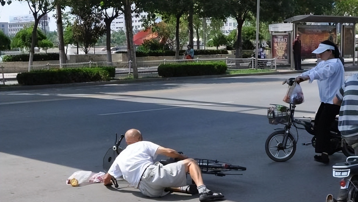 途中,他看见一位老人连人带车摔倒在地,腿被自行车压着,挣扎着想要起身却无能为力。