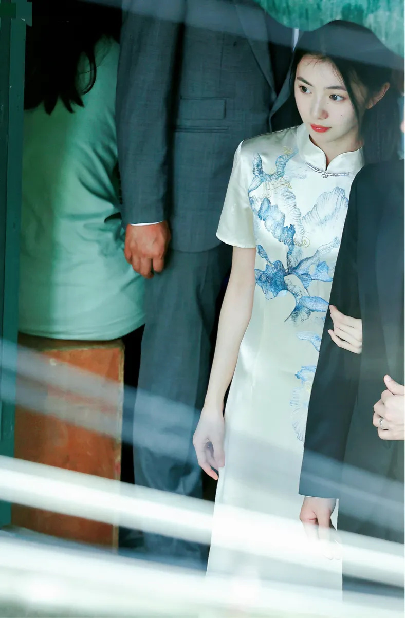 刘浩存身穿的这件旗袍,无论是色彩还是款式上,都属于改良版本,颜色清新中还带着甜美,更适合少女系女生来穿,显白显气色!胸前的蓝色印花更是温柔中透漏着恬静之感!传统韵味十足!搭配一双白色尖头高跟鞋;优雅中带着女人味儿!气质清新优雅!