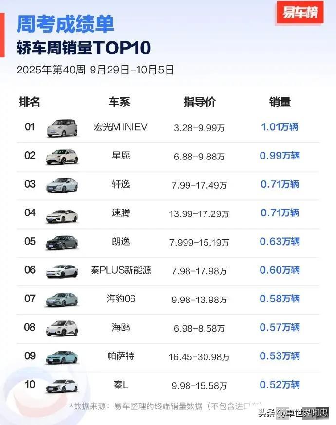 导读:2025年10月首周(9.29/10.5)轿车终端销量数据已出炉,从榜单数据来看,内呈现出“电动化加速,燃油车坚守” 的双轨发展格局。其中新能源车型略占优势,榜单前十占六名,五菱宏光MINIEV以及吉利星愿这两款常青树车型依旧遥遥领先,销量势不可挡。而作为国内销量一哥的比亚迪表现更加强势,旗下多款新能源车型入围榜单前十,包括秦PLUS新能源(第6)、海豹O6(第7)、海鸥(第8)和秦L(第10)等,显示出其在轿车领域的全面布局已见成效。传统燃油车守住半壁江山。日产轩逸、大众速腾、大众朗逸和大众帕萨特等四款燃油车分别位列第三、第四、第五和第九名,其中轩逸和速腾均取得了0.71万辆的销量成绩,证明部分燃油车在消费者心中地位仍然稳固。