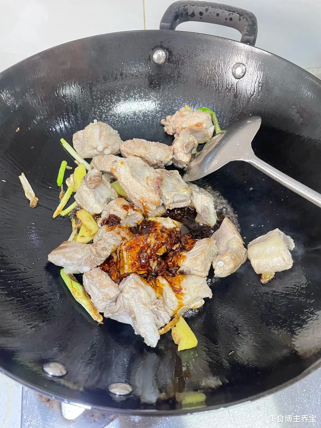 4、放入切好的姜片、蒜末,八角、桂皮等香料,快速翻炒出香味。香料的香味被激发出来,能为整道菜奠定浓郁的香味基础。加入适量生抽、老抽,继续翻炒,让排骨均匀上色,生抽提鲜,老抽上色,两者搭配,使排骨味道鲜美,色泽红亮。