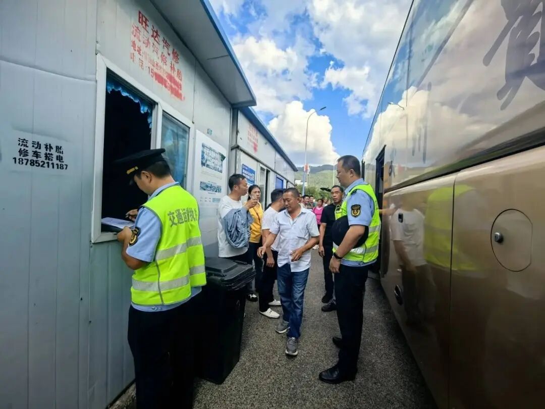 执法人员抵达现场后,发现该车核载54,实载50人,其中乘客47人,驾驶员3人,从遵义市湄潭县前往福建省宁德市,驾驶员称该车出现水箱系统故障,便在紧急停靠应急车道,但由于国庆假日期间车流量较大,存在较大安全隐患,执法人员立即与高速交警部门协商,决定将该客车缓速带道行驶至最近收费站下站。