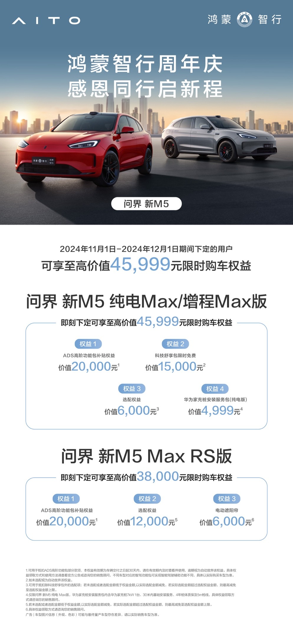 问界 新M5 纯电Max/增程Max版:即刻下定可享至高价值45999元限时购车权益——价值20000元ADS高阶功能包补贴权益;价值15000元科技舒享包限时免费;价值6000元选配权益;价值4999元华为家充桩安装服务包(纯电版);