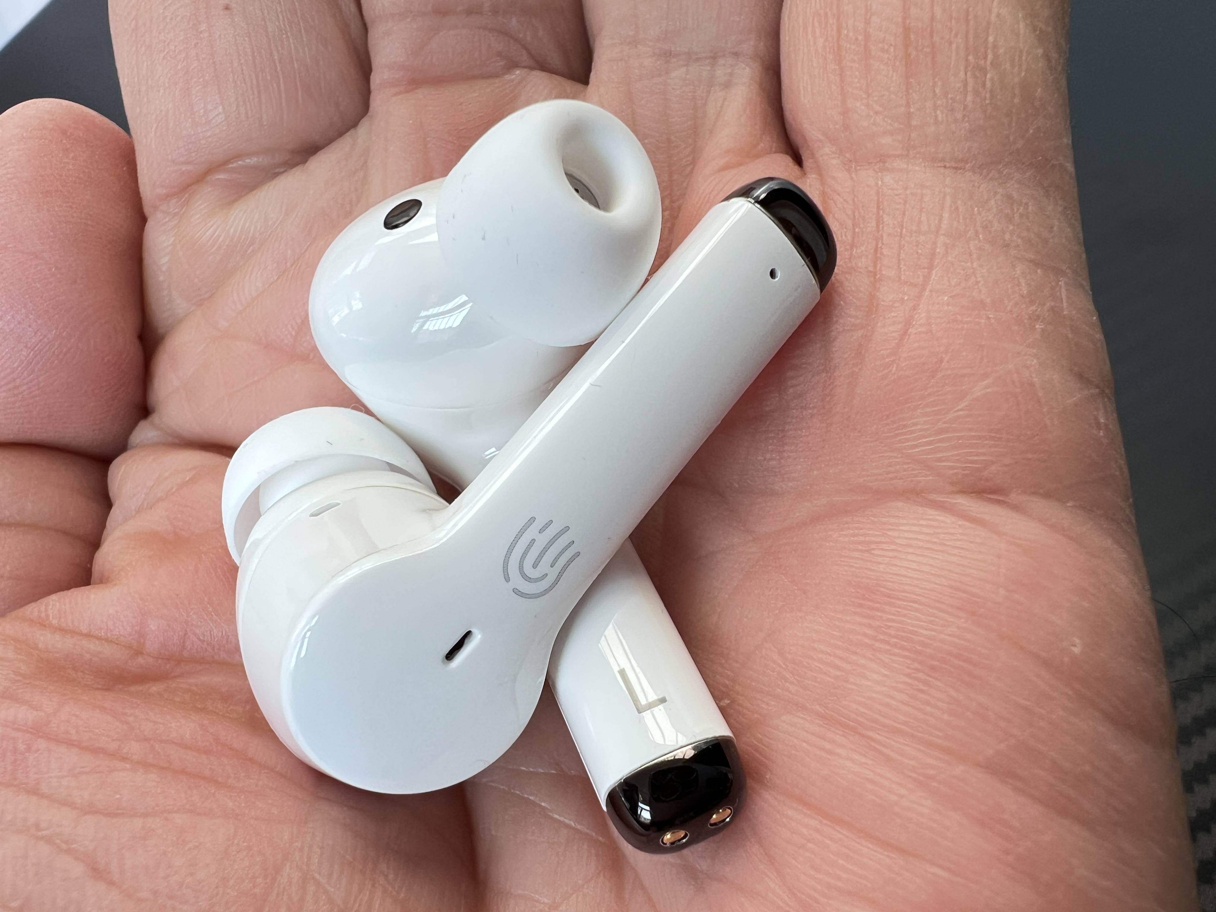助听器外观设计充分考虑了人体工学原理,入耳部分配有硅胶软圈,小巧轻盈(单边仅重4.9g),佩戴起来稳固且不易掉落,也非常舒适。两个大小不同的耳帽供用户选择,确保佩戴的紧密性和舒适度,即使长时间佩戴也没有问题。机柄上有收音孔和触摸感应区域,下方是充电接口。
