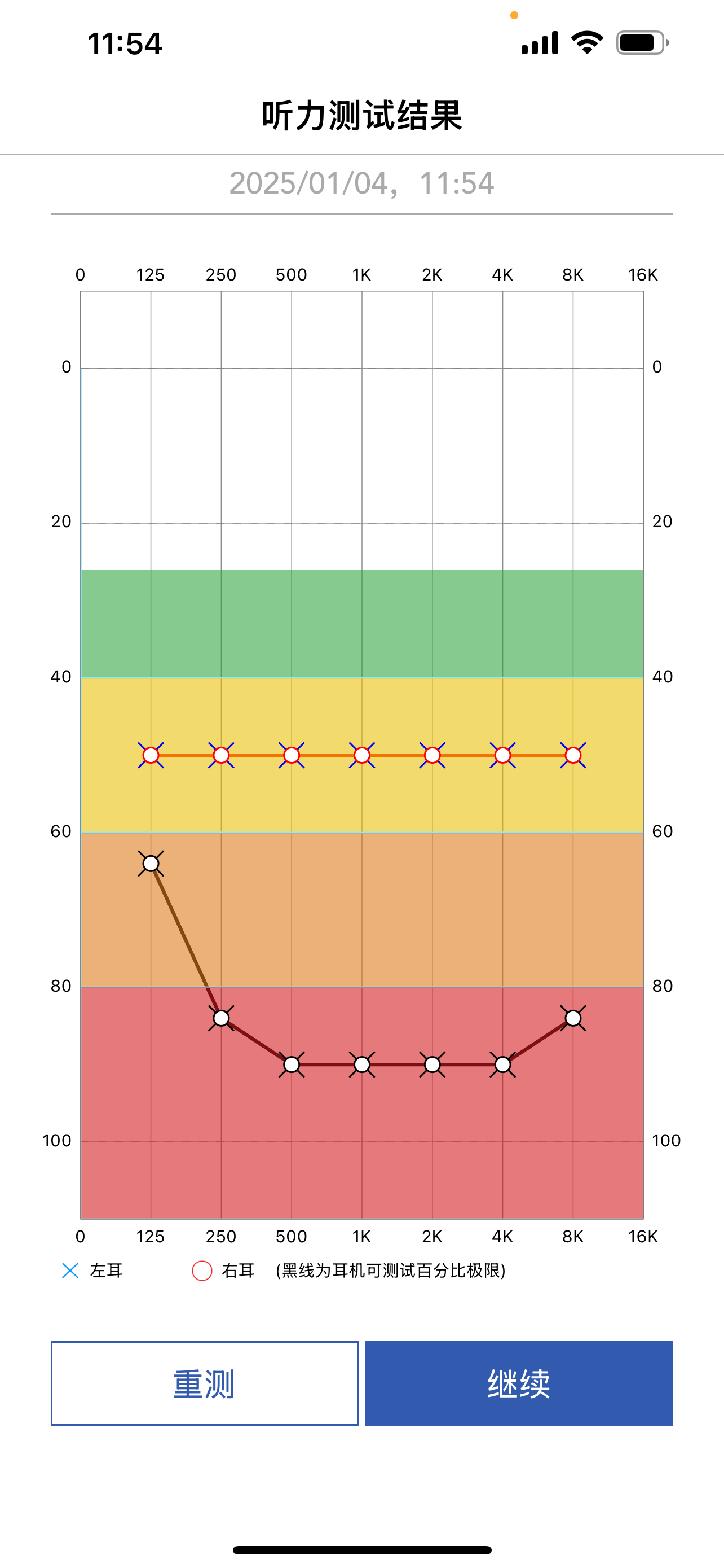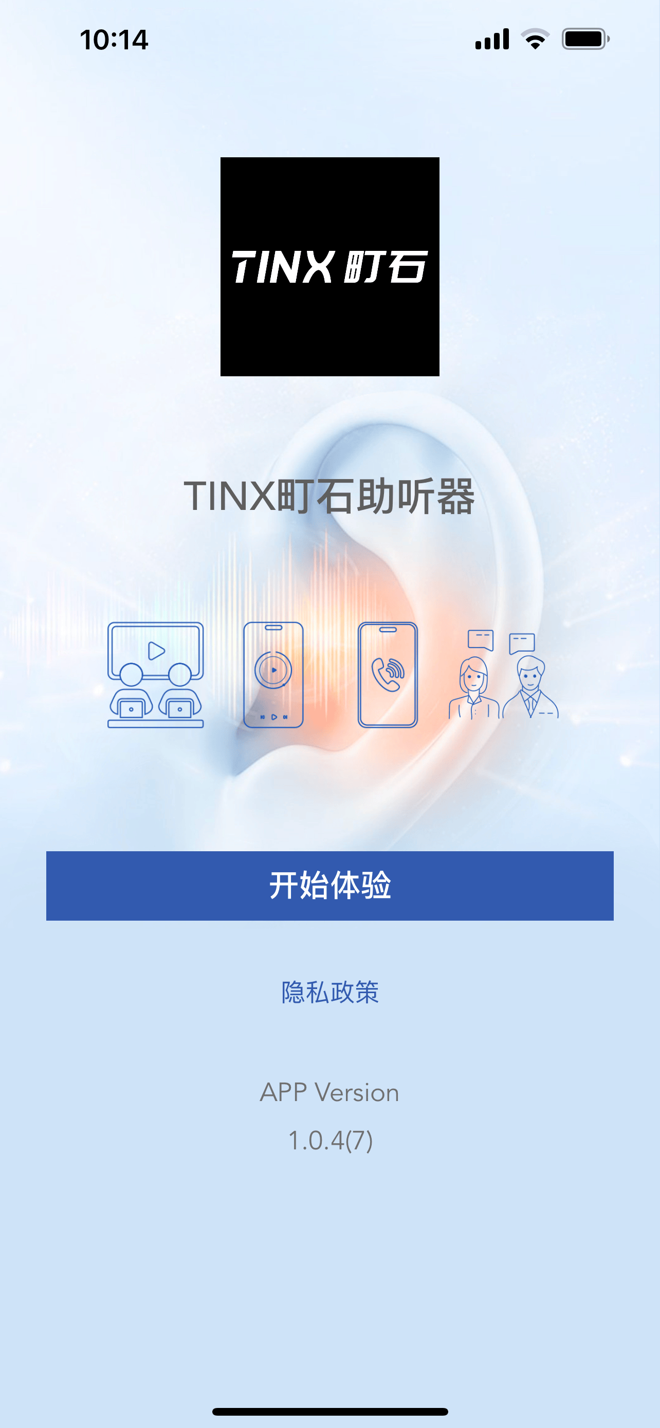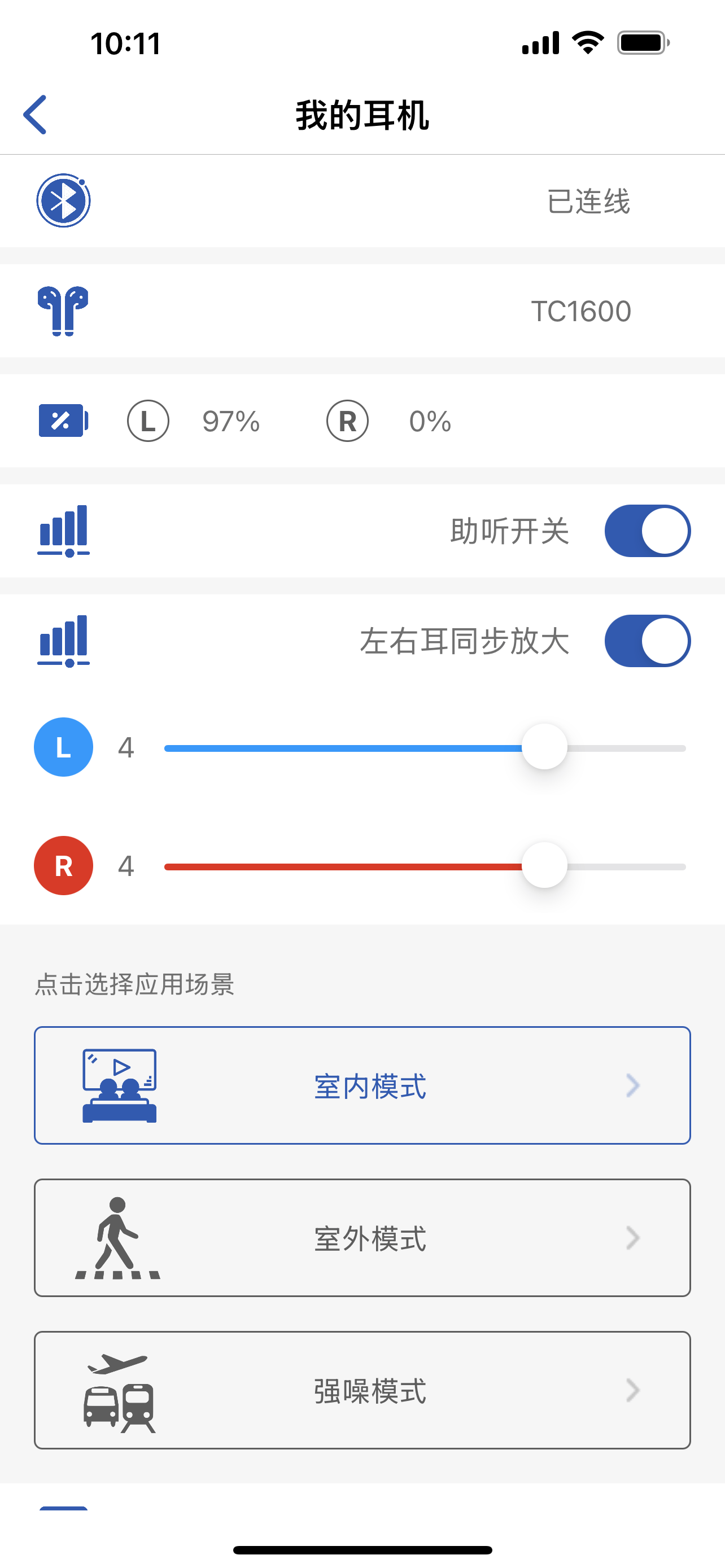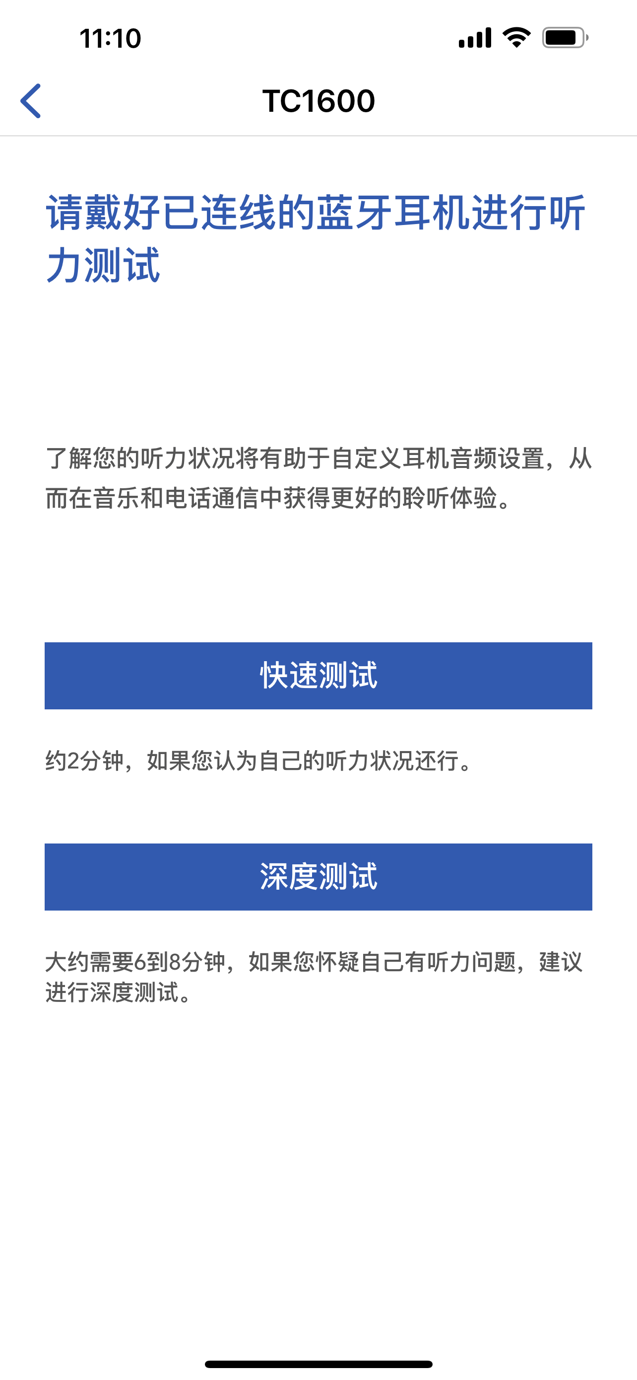 町石tinx助听器配备了专属APP,手机安装APP后,可 在线验配,并针对个人听力进行设置。APP主界面可以看到剩余电量,有3种模式切换,控制左右耳音量。重要的是APP提供了听力测试功能,根据自身听力受损程度来自定义设置和调整左右耳音频平衡。通过听力实测得到听力图标,并匹配最佳助听参数。