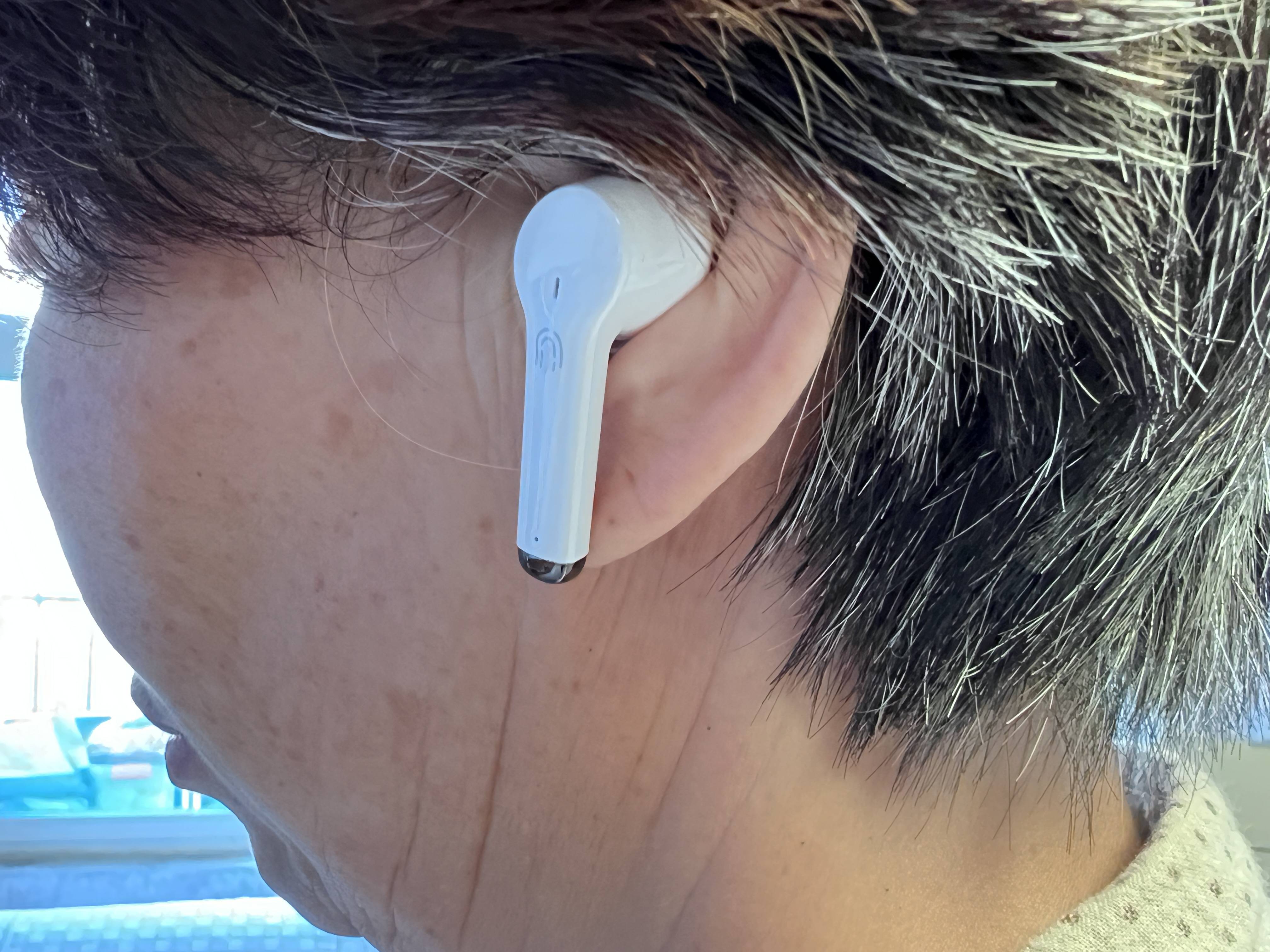 大家可以看到,耳柄外侧中部“指纹”图标为触控区域,可以随手“盲操”,通过触碰调节助听音量,也可在蓝牙耳机模式下进行播放/暂停音乐,接听/拒接电话等常规操作。这款助听器播放音乐歌曲时会自动切换为音乐模式,单击触摸键可暂停和播放歌曲,双击可调节音量大小;电话模式下,双击触控按键即可接听电话,长按2秒拒接电话,如果想挂断电话,同样也是双击。