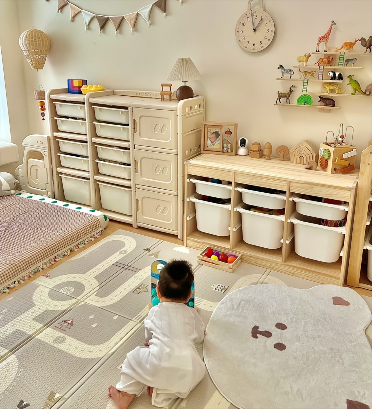 做法也很简单,全屋都铺上了爬爬垫,孩子在上面玩耍,做家长的也放心,其他的家具也没必要在装修的时候买好,有孩子之后一点点往里面添置就行了。