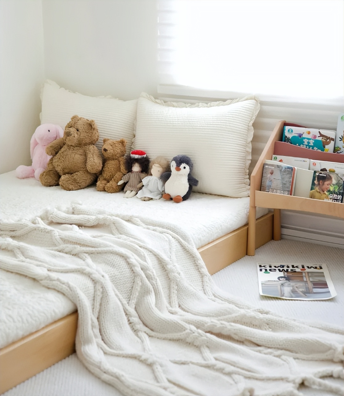 之所以选落地床架,也是因为放上床垫,距离地面也不过20厘米高度,孩子在上面睡觉,不用担心跌落的问题出现。