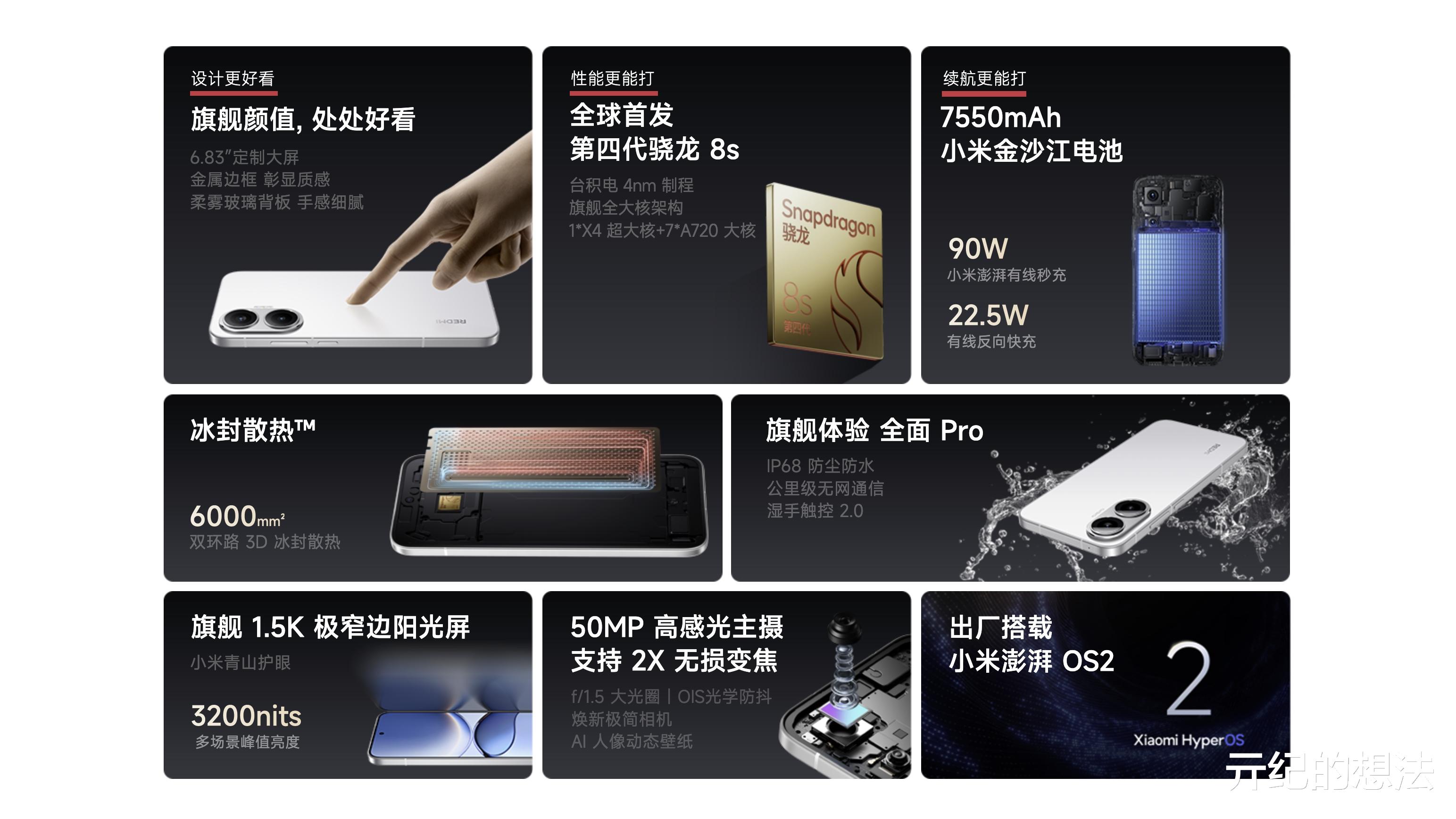 机身采用航空铝合金中框,搭配旗舰同款的柔雾玻璃后盖,整机的质感和手感有了明显的提升。耐用性方面也很惊艳,首先是抗弯折性能高达70kg,然后通过了1.5米高强跌落测试和南德整机五星卓越品质认证,还有IP68级别防尘防水。机身内置小米T1S通信芯片,不仅支持小米星辰AI多网融合,还新增了公里级无网通信功能。