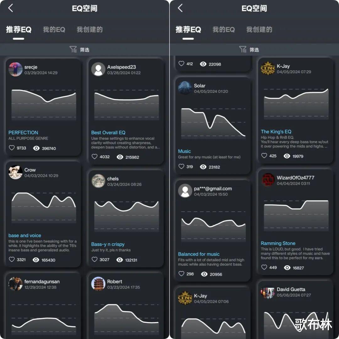 EQ空间里用户自己分享的无数EQ配置文件,可以直接调用。