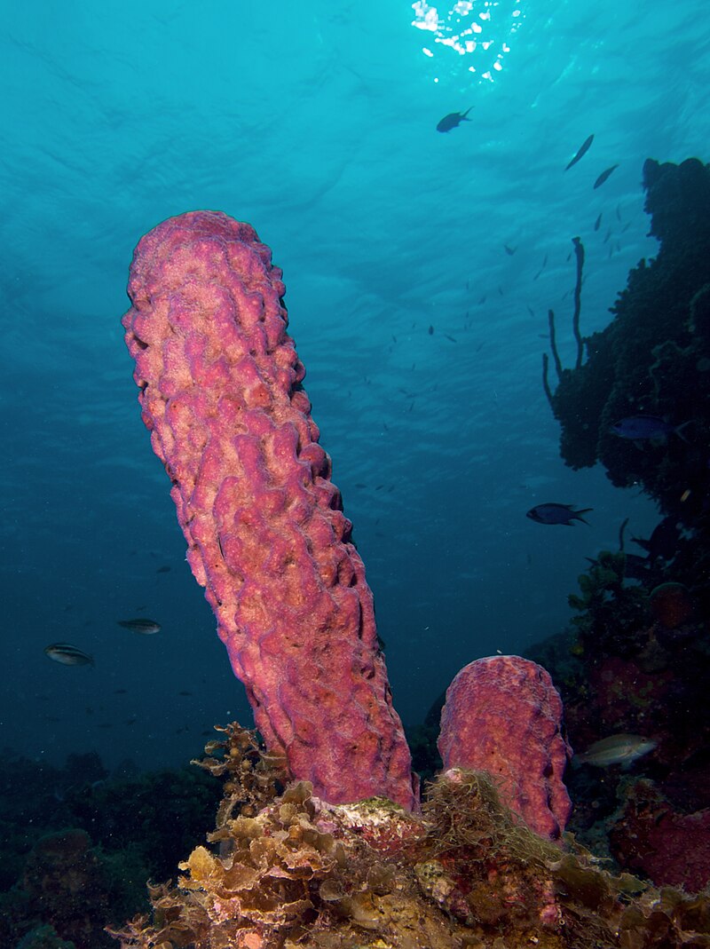 海绵是一群一动不动就像植物一样生长的、通过过滤海水获取食物的动物,它们是一个庞大类群,目前世界上已描述海绵有11000多种,可能至少还有14000种未被描述。