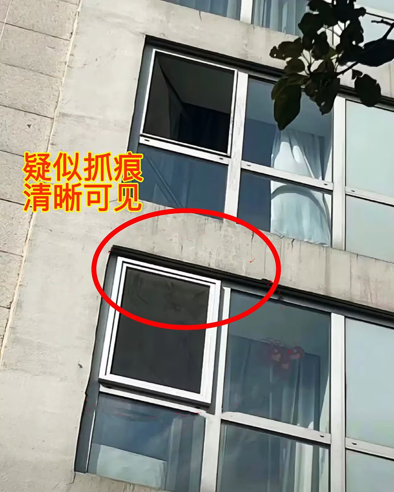 更加令人恐怖的是,有网友甚至上传了事发现场的照片,显示于朦胧坠落正下方的窗户玻璃存在抓痕,这就更加令人不寒而栗了。