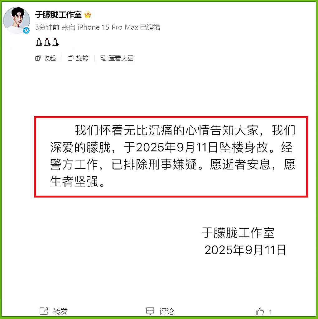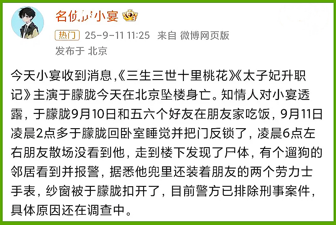而且官方也没有发通报予以证实。即便是于朦胧方面,虽然9月11日晚间,该工作室发文证实了于朦胧坠亡的消息,但并没有披露事发详细过程。关于于朦胧的死因真相,其工作室发文称,经警方工作,已经排除刑事案件的嫌疑,但是截止到目前,警方并没有发通报回应此事。