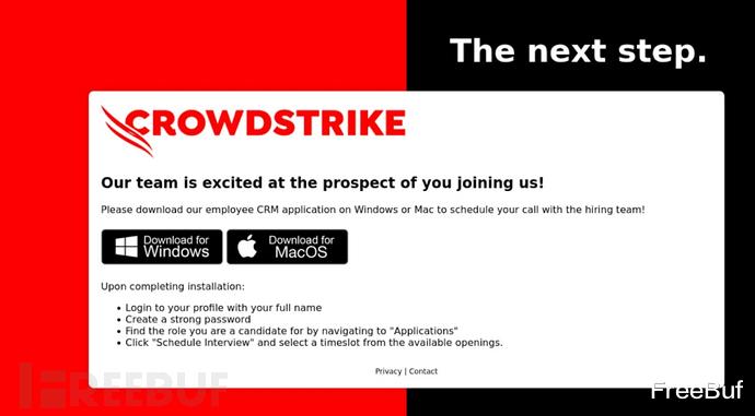 一旦点击应用程序下载链接,受害者将被带到一个网站(cscrm-hiring[.]com),其中包含下载适用于 Windows 或 macOS系统的上述应用程序链接。