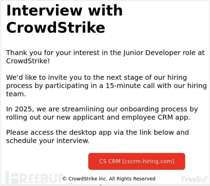 该公司于 2025 年 1 月 7 日发现了这一恶意活动,钓鱼邮件称自己来自CrowdStrike 就业代理,邀请受害者下载一个看似合法的“员工 CRM 应用程序”,称该程序是为了帮助应聘者简化入职流程。