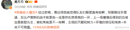 媒体人勇方方发文点评:经过昨晚,看这场我就觉得队友们眼里真有他啊,球刷刷往手里递,在比卢普斯的战术板里他一定是存在感很高的一环,上一场撞墙后得到的也肯定是鼓励为主,首轮秀就是不一样啊,主观的天赋和努力+环境的信任和培养=未来不可限量。