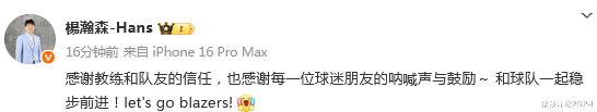 赛后,杨瀚森更新社媒发文表示:感谢教练和队友的信任,也感谢每一位球迷朋友的呐喊声与鼓励~ 和球队一起稳步前进!let's go blazers!