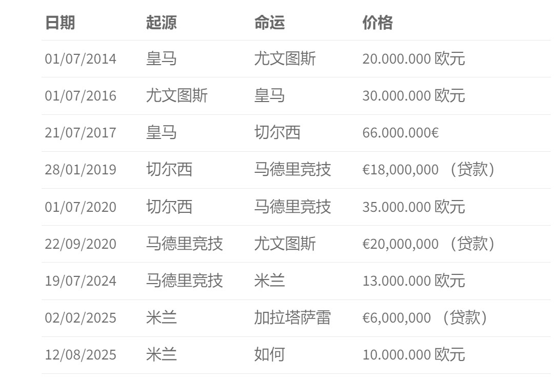 过去5年,莫拉塔几乎成了“转会市场永动机”: 2019年租借马竞(1800万欧),2020年被买断(3500万欧),同年又租给尤文(2000万欧); 2024年转会米兰(1300万欧),半年后租借加拉塔萨雷(600万欧),如今再跳槽科莫。他的身价像被反复交易的股票,但俱乐部们始终愿意买单。2.23亿欧转会费中,租借费占比超30%。
