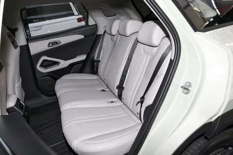 座椅同样是仿皮材质,填充适中,支撑性很好。我调整好前排坐姿后,后排腿部还有两拳左右的空间,头部有一拳富余。地台接近全平,三人乘坐完全没问题。后排座椅放倒后容积能达到1320L,装大件物品更轻松。同样支持3.3kW对外放电,露营也能满足用电需求。