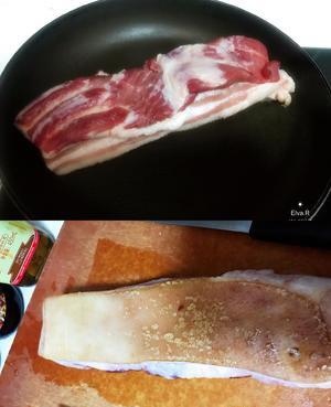 2.将肉清洗干净,锅内什么都不放,将🥩肉皮贴紧锅底,将猪毛烧掉,猪皮烧至起泡。