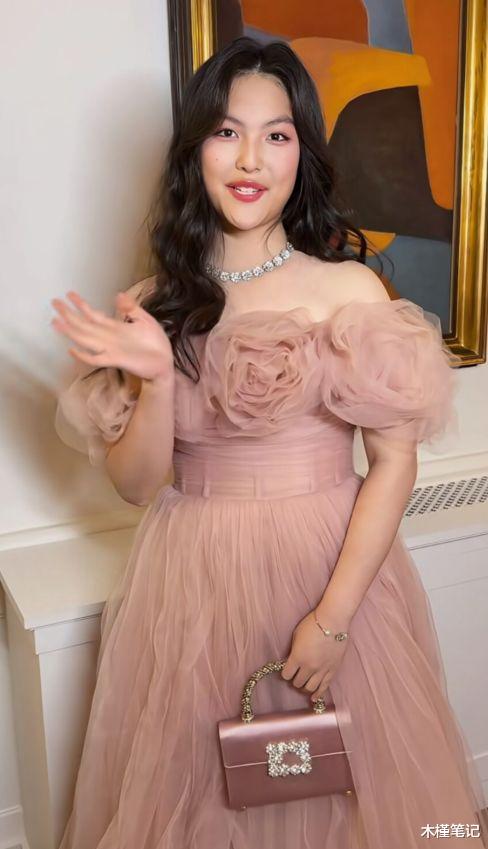 当天王诗龄身穿粉色露肩拖地长裙,脖子上戴着名贵珠宝,手上拿着包,一头卷发披肩,虽然才16岁,但却十分成熟。王诗龄对着镜头打招呼,虽然现场大咖云集,但却似乎不胆怯,相反还气场强大。