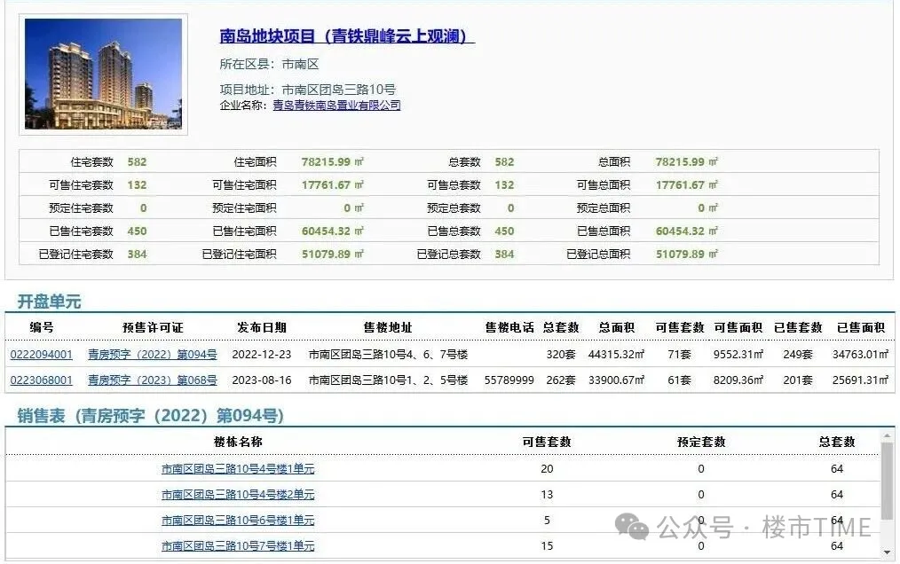 云上观澜在2022年底首开,开盘均价约3.8万/㎡,堪称豪宅价格。但团岛片区在外地人和年轻人眼中影响力有限,结果高不成低不就,开发商高估了这片老城区对大众的吸引力,一开始定价策略就跑偏了。