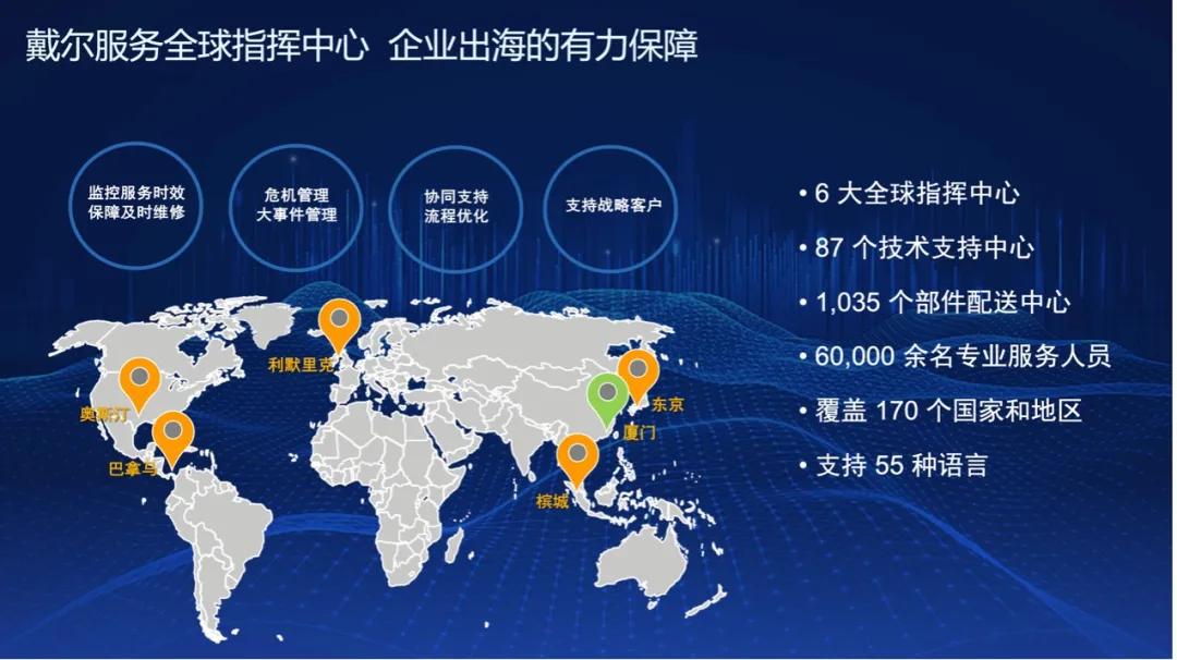 最后,戴尔服务全球指挥中心,也为企业出海提供了有力保障。依托6大全球指挥中心、87个技术支持站、1035个部件配送中心及6万名专业服务人员,戴尔科技还构建起覆盖170个国家和地区、支持55种语言的立体服务网络,确保7×24小时快速响应。