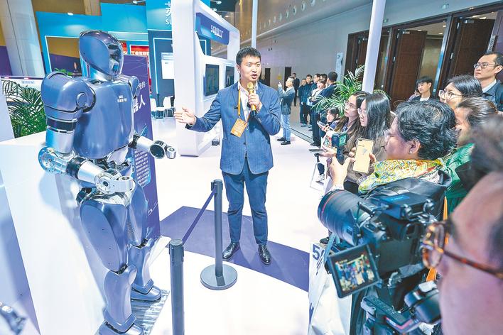中国5G+工业互联网大会成果展示区的格蓝若机器人“劳动者1号”吸引参会嘉宾关注。(湖北日报全媒记者 魏铼 摄)