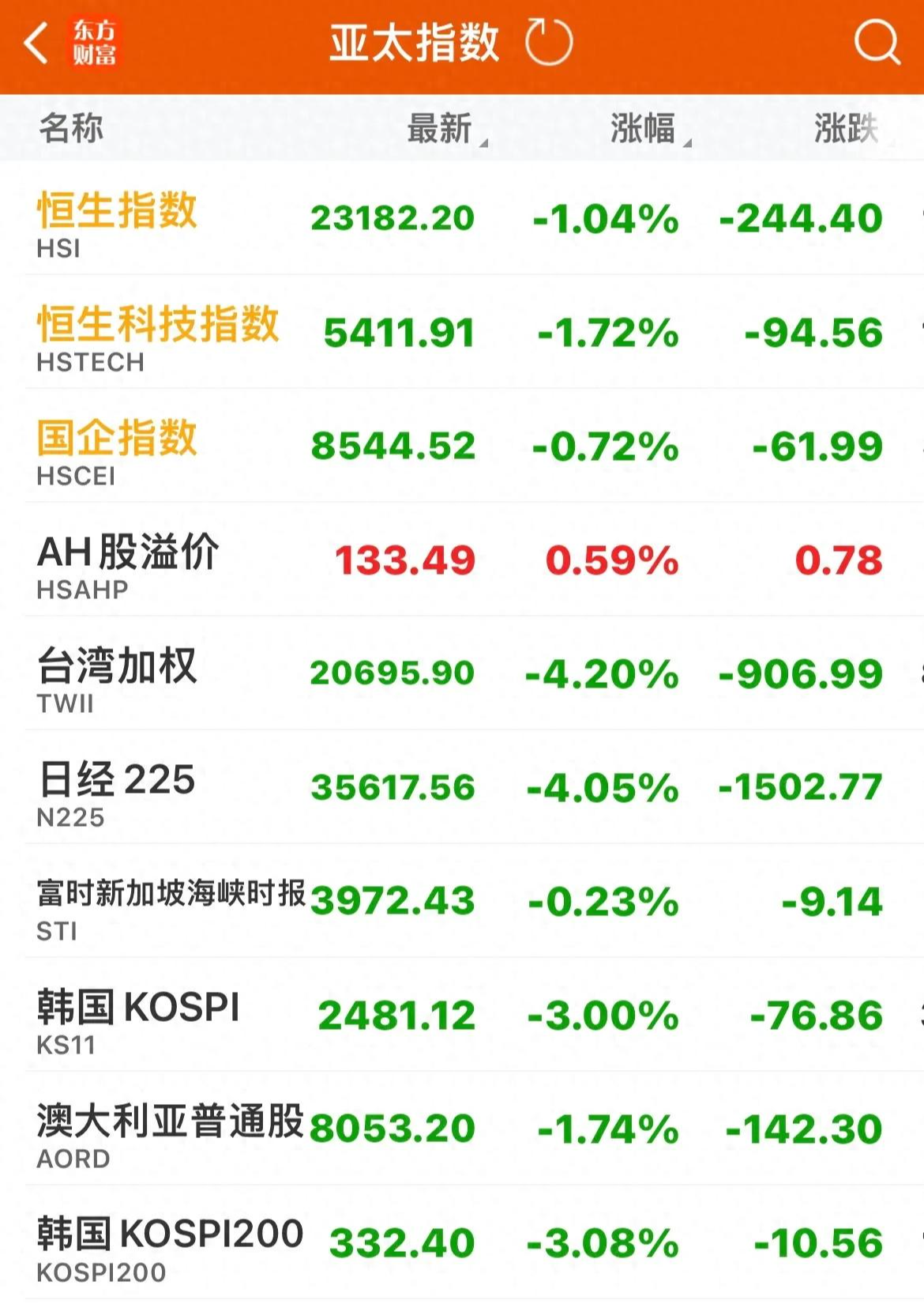 因为今天亚洲股市也全线下挫,加权跳空低开收盘大跌4.20%,日经跳空低开盘中大跌超4%;韩指也是跳空低开,盘中大跌超3%,今天韩股市恢复卖空交易,所以更是出现了大跌。