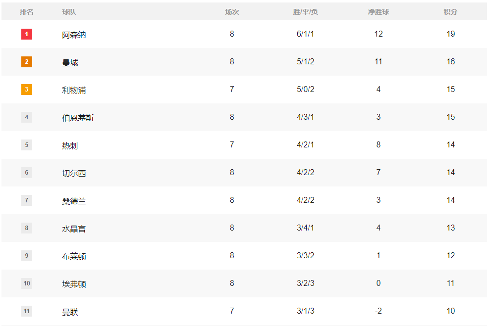 阿森纳1-0战胜富勒姆后,6胜1平1负积19分领跑;曼城2-0战胜埃弗顿后,5胜1平2负积16分,以3分之差暂居第二。
