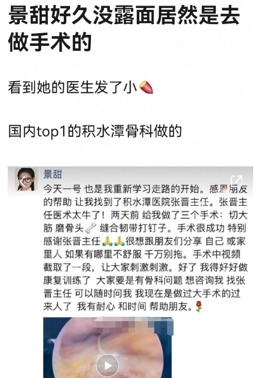 从景甜朋友圈得知,她两天前做了三个手术,切大筋磨骨头缝合韧带打钉子,手术很成功,还公开了一部分手术中视频,景甜还说如果自己或家里人有哪里不舒服,千万别拖,动态中景甜还特别感谢了张主任。