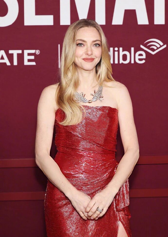 谁再说 “红毯红裙 = 艳的堆浓俗感”?看 Amanda Seyfried 这波「女佣」首映礼 —— 抹胸红缎裙的廓形刚