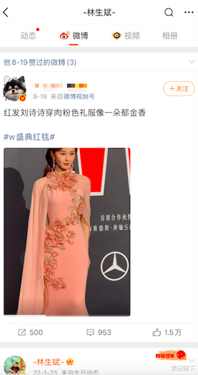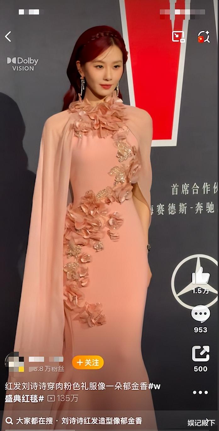 这条被点赞的内容里面,原账号博主夸赞表示:“红发刘诗诗穿肉粉色礼服像一朵郁金香”。