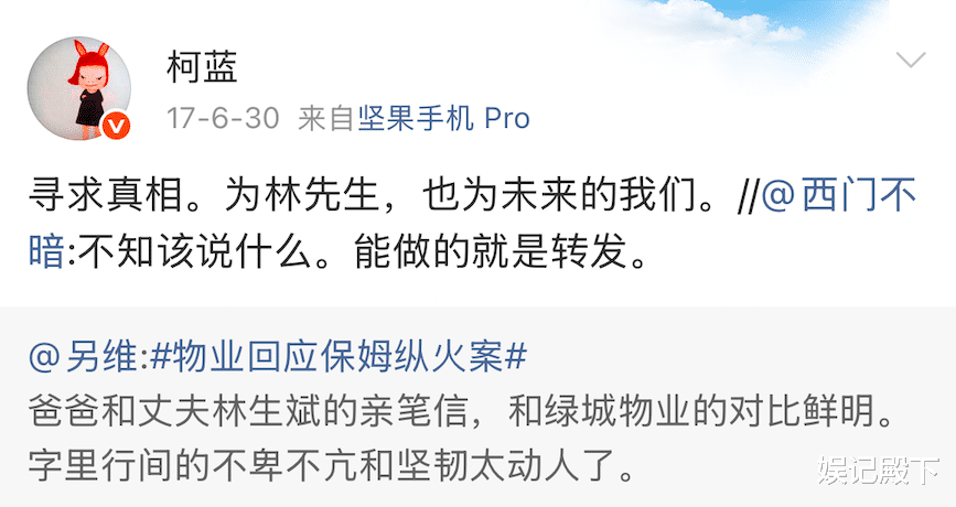 女演员柯蓝曾数次在网络上力挺林生斌,用自己的力量为其帮忙,在所有的演员里面,柯蓝是最用心的,直至这件事情发生两年她还在用自己的影响力帮忙。