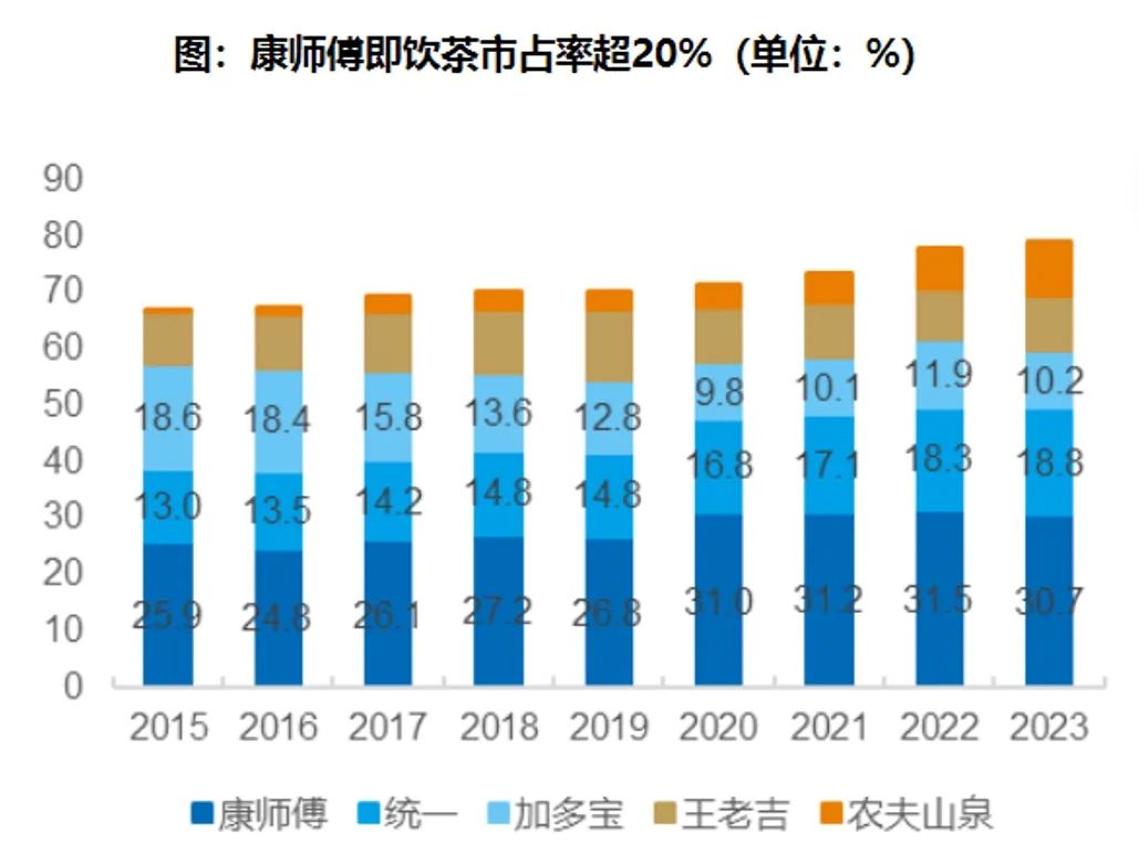 据国金证券,近年来康师傅在即饮茶市场的市场占有率在30%左右,与此同时,饮品业务贡献了集团总营收的60%以上,其中茶饮更是独占40%的功劳,堪称业绩顶梁柱。