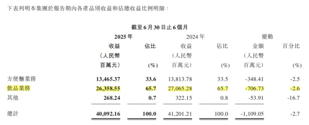 回到康师傅的营收结构,今年上半年,饮品业务收入263.59亿元,占总营收的65.7%(方便面业务也在下滑)。