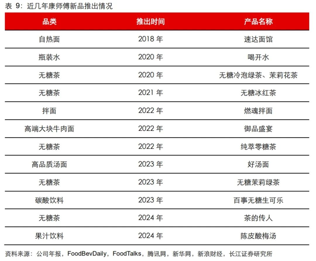 行业对比来看,早在2011年,农夫山泉就推出了东方树叶,而康师傅直到2021年才正式推出无糖冰红茶,此时农夫山泉与三得利早已牢牢占据80%以上的市场份额。2024年,康师傅推出精品无糖茶饮品牌“茶的传人”,市场更是红海一遍。