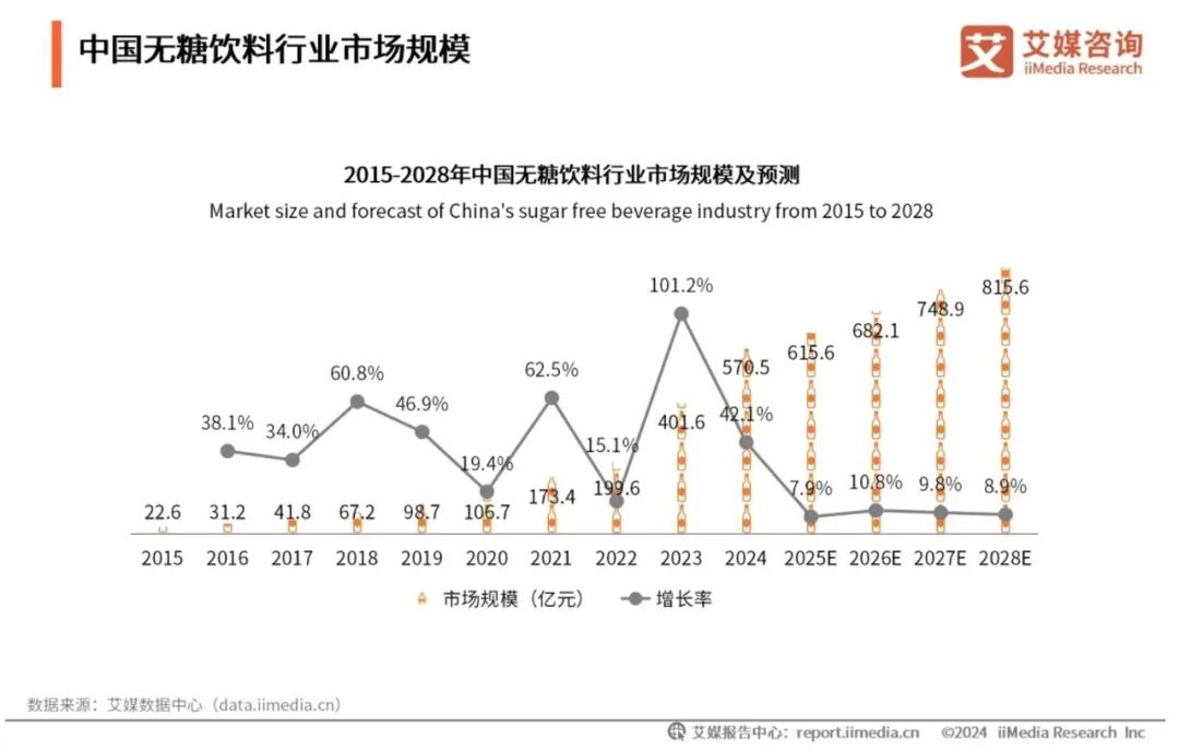 以无糖饮料为例,艾媒咨询数据显示,2015-2023年,无糖饮料行业整体市场规模从22.6亿元飙升至401.6亿元,预计到2028年将突破800亿元。