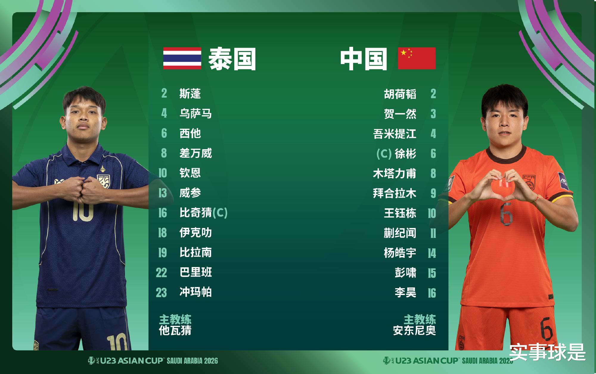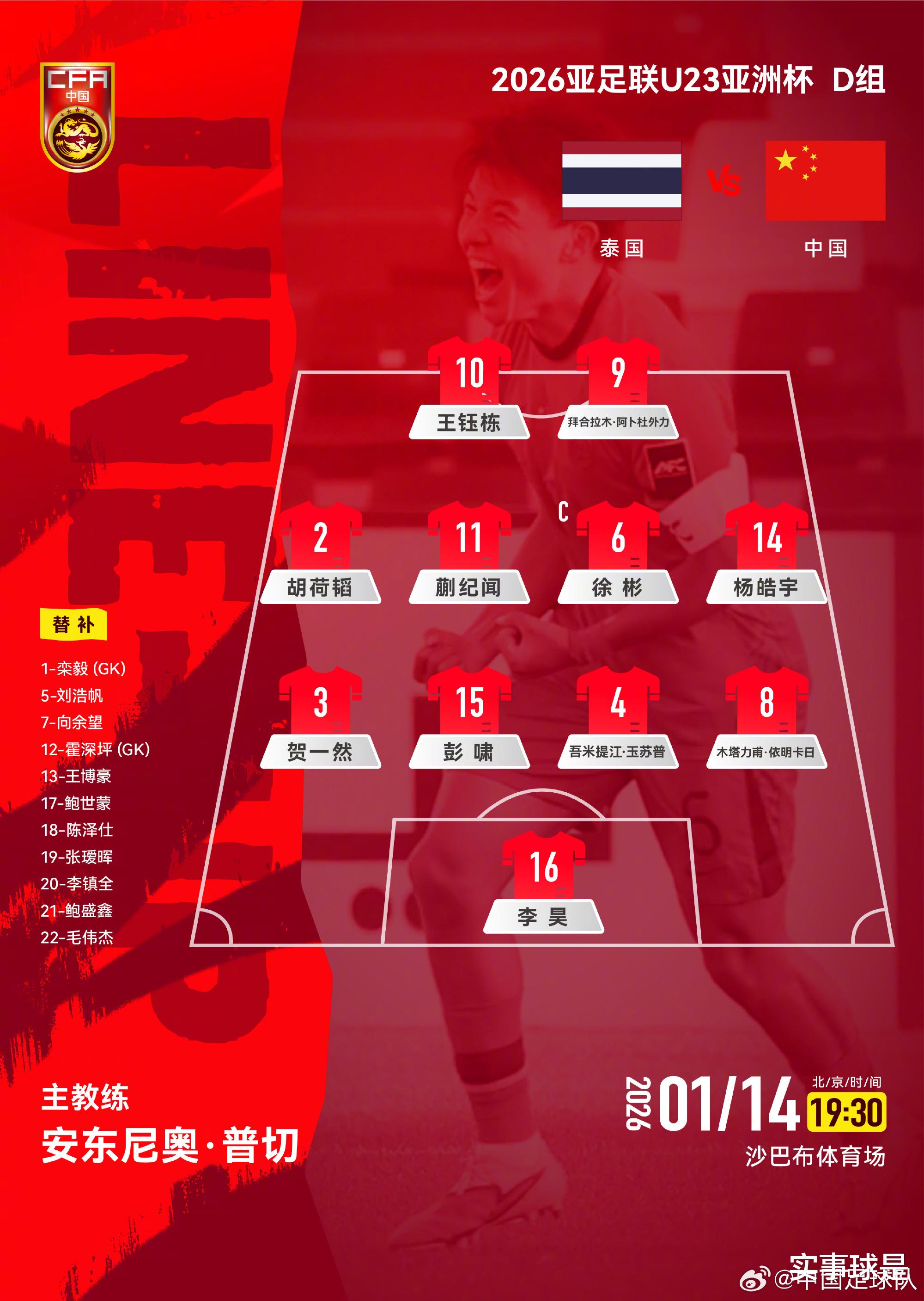 此役,中国U23队主教练安东尼奥·普切依然安排徐彬担任场上队长,李昊司职门将,胡荷韬、贺一然、吾米提江、彭啸、杨皓宇、木塔力甫、蒯纪闻、拜合拉木、王钰栋同时首发。