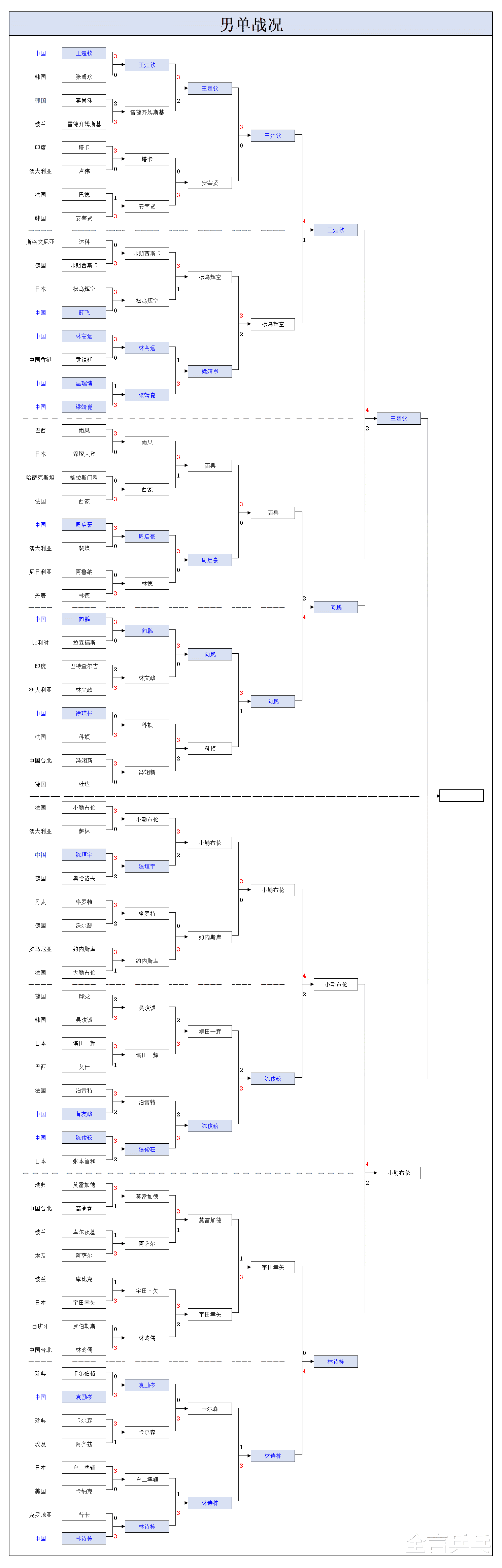 王楚钦:3-0张禹珍(韩国)、3-2雷德齐姆斯基(波兰)、3-0安宰贤(韩国)、4-1松岛辉空(日本)、4-3向鹏(中国)。