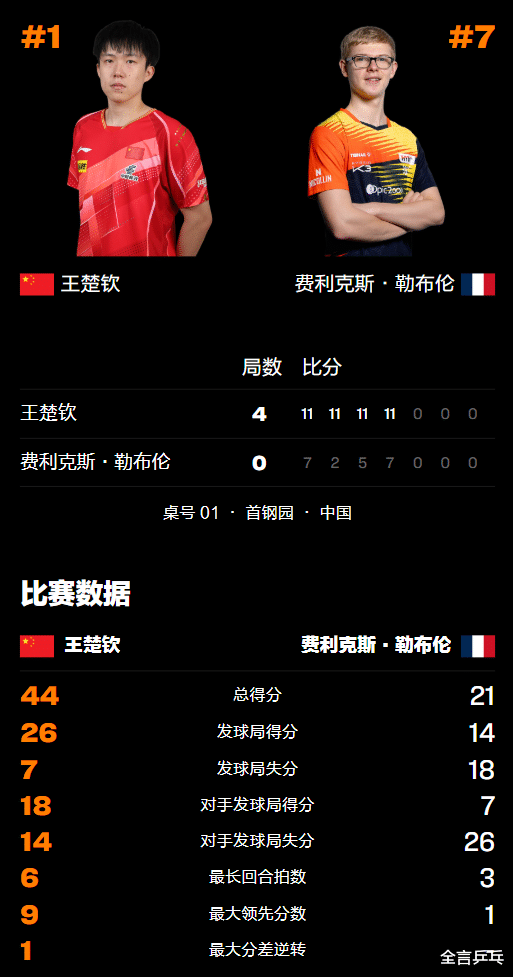 比赛开始后,王楚钦在首局便迅速进入状态,没有因为半决赛的苦战而出现疲态,很快便6-1、9-3领先小勒布伦,错失3分后赢1球10-6拿到局点,最终以11-7成功拔得头筹。