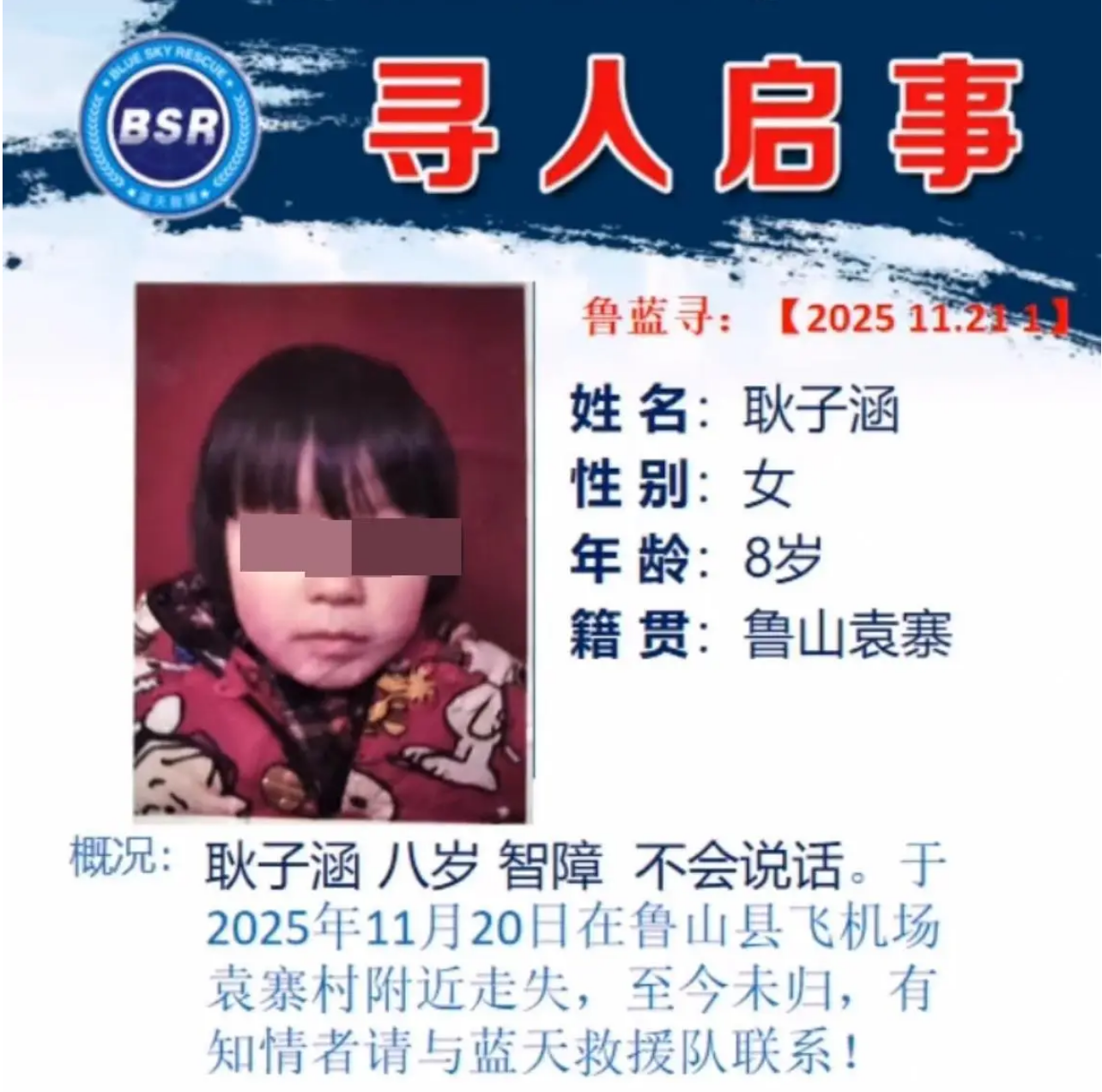 据了解,11月20日下午,七十多岁的奶奶带着患有智力障碍的孙女耿子涵前往十公里外的袁寨村上坟。返程途中,奶奶用绳子将孩子系在电动车上,随后进入亲戚家短暂停留。不到十分钟后出来,发现孩子已挣脱绳子不见踪影。