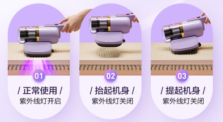 另外,它还配备了253.7nm波长的紫外线杀菌灯,符合有效杀菌波长要求,同时带有防泄漏设计,只要除螨仪离开清洁表面或停止工作,紫外线灯就会自动关闭,不用担心伤害家人和宠物。