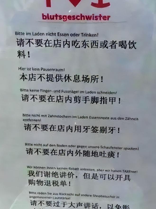 2019年,有中国游客在柏林市中心的Blutsgeschwister分店,发现了一张扎眼的中文告示。