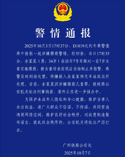 2025年10月3日17时35分,D1819次列车7号车厢内,34岁的余某某对一名7岁女童实施猥亵(包括摸头、亲吻小脸蛋等行为),被女童母亲当场发现并制止。女童母亲随即报警,乘警到场处置后,将余某某移交车站派出所。目前,余某某因涉嫌猥亵儿童罪,被铁路公安机关依法刑事拘留,案件正在进一步侦办中。