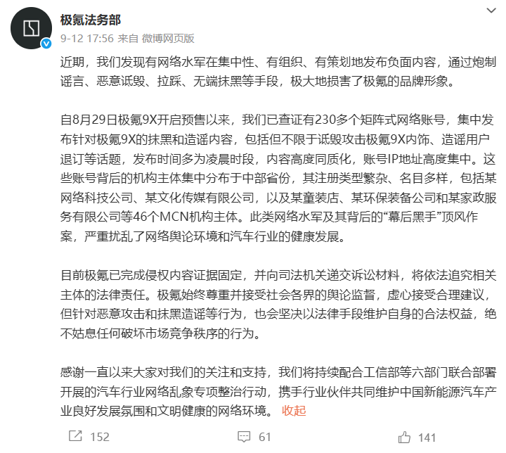 9月12日,极氪法务部发布声明,自极氪9X开启预售以来,已经监测和查证到46个MCN机构旗下的超过230个账号集中发布针对极氪9X的抹黑攻击和造谣内容。而从声明披露的细节能明显看到,大量账号发布的内容,不仅高度同质化,还集中时段、集中IP发布,有明显的策划和组织性。还有一个更加可笑的细节是,这些账号背后的MCN机构,甚至还有某童装店、某环保装备公司和某家政服务公司等,可以说这些网络水军背后的“黑手”,已经猖獗到了无法无天的地步。