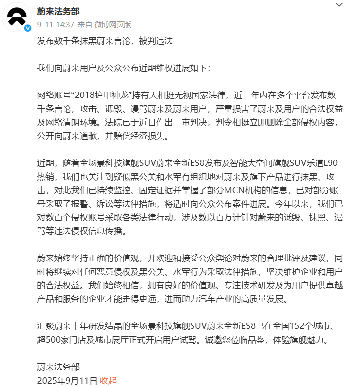 伴随相关部门的专项行动,极氪、蔚来、小鹏等车企第一时间响应,并晒出自身依法维权的案例。其中极氪表示目前已完成侵权内容证据固定,并向司法机关递交诉讼材料,将依法追究相关主体的法律责任;蔚来和小鹏则是公开了向法院起诉侵权内容和责任人的判决结果。这既是对企业自身权益的维护,也有利于营造更加健康良好的发展环境。