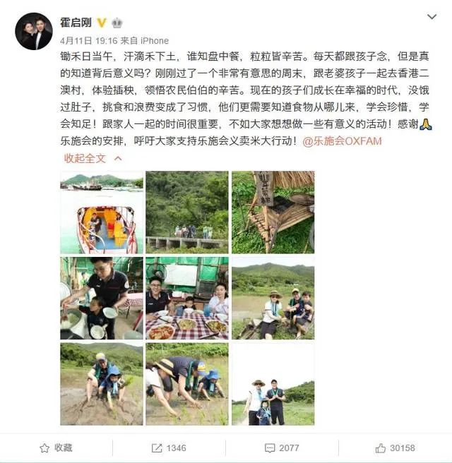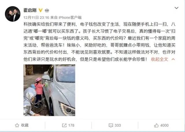 霍启刚曾分享:“周末我们有一个家庭活动,帮爸爸洗车!妹妹小,奖励好吃的,哥哥就赚点小零用钱。”他希望通过这种方式让孩子们明白“买东西的代价”,“不能说见到喜欢就要”。
